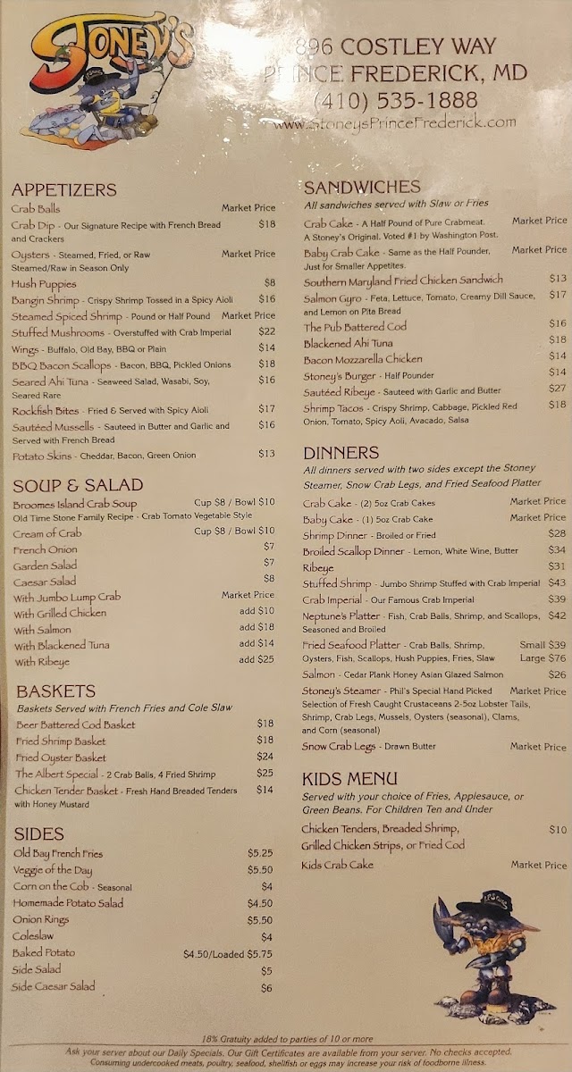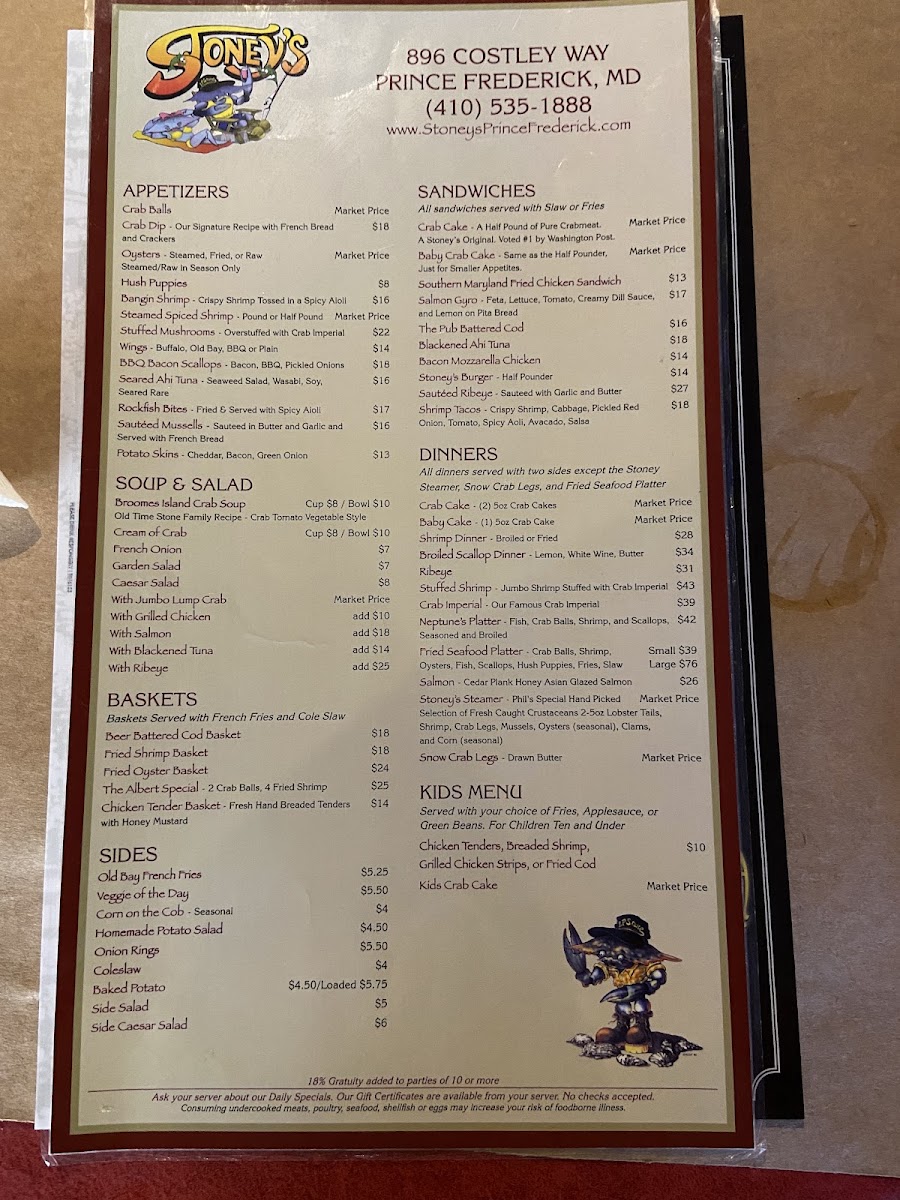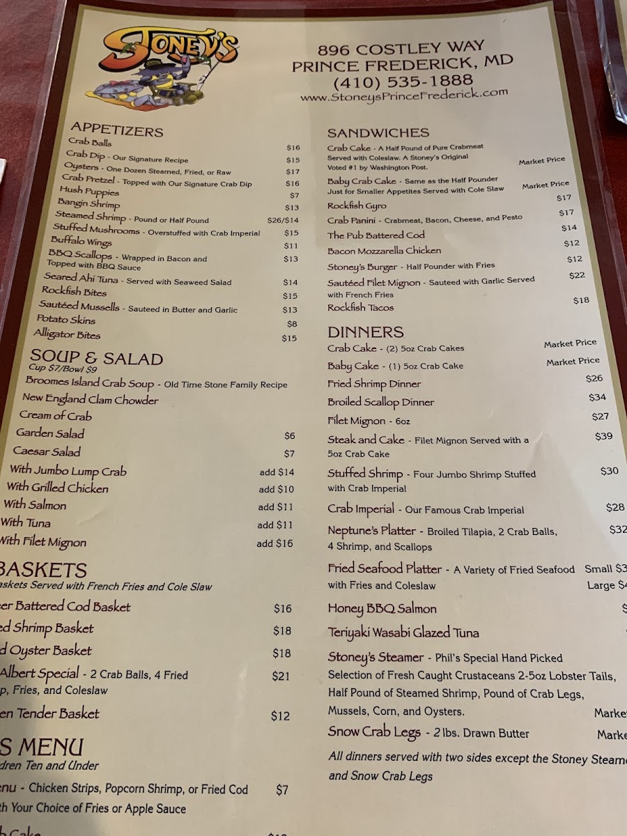 1 Crab Balls, 2 Shrimp, 3 Oysters, Fish, 3 Scallops, 3 Hush Puppies, Fries, Slaw